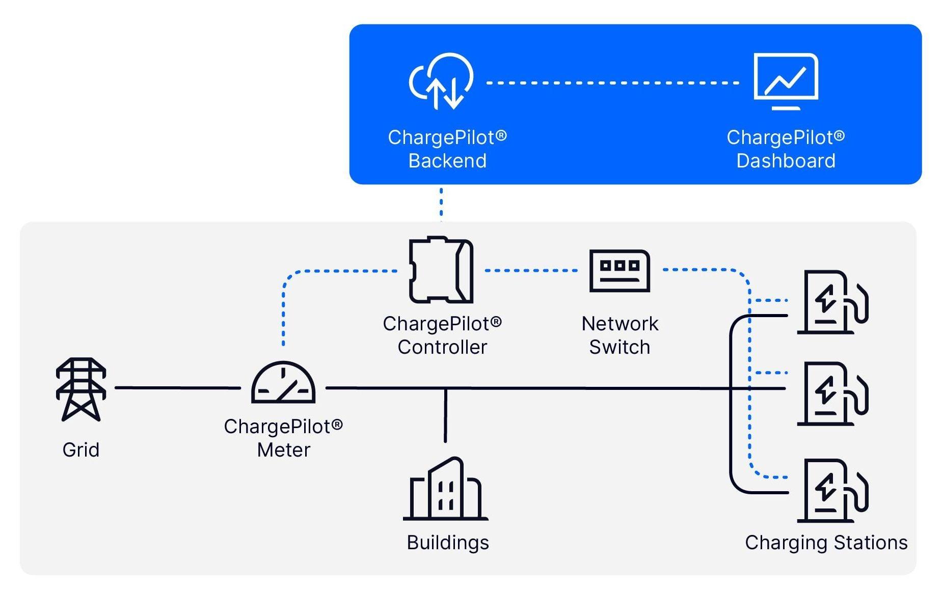The ChargePilot® Controller is installed on site, establishing a data connection between charging points and the mains connection. It manages energy flows in real time, enabling precise consideration of local consumers like buildings and generators such as solar systems, down to the second. With load measurement and charging power optimization taking place locally, ChargePilot® is practically fail-safe and ensures optimal load management even in scenarios with temporarily unstable internet connection or brief local power fluctuations.