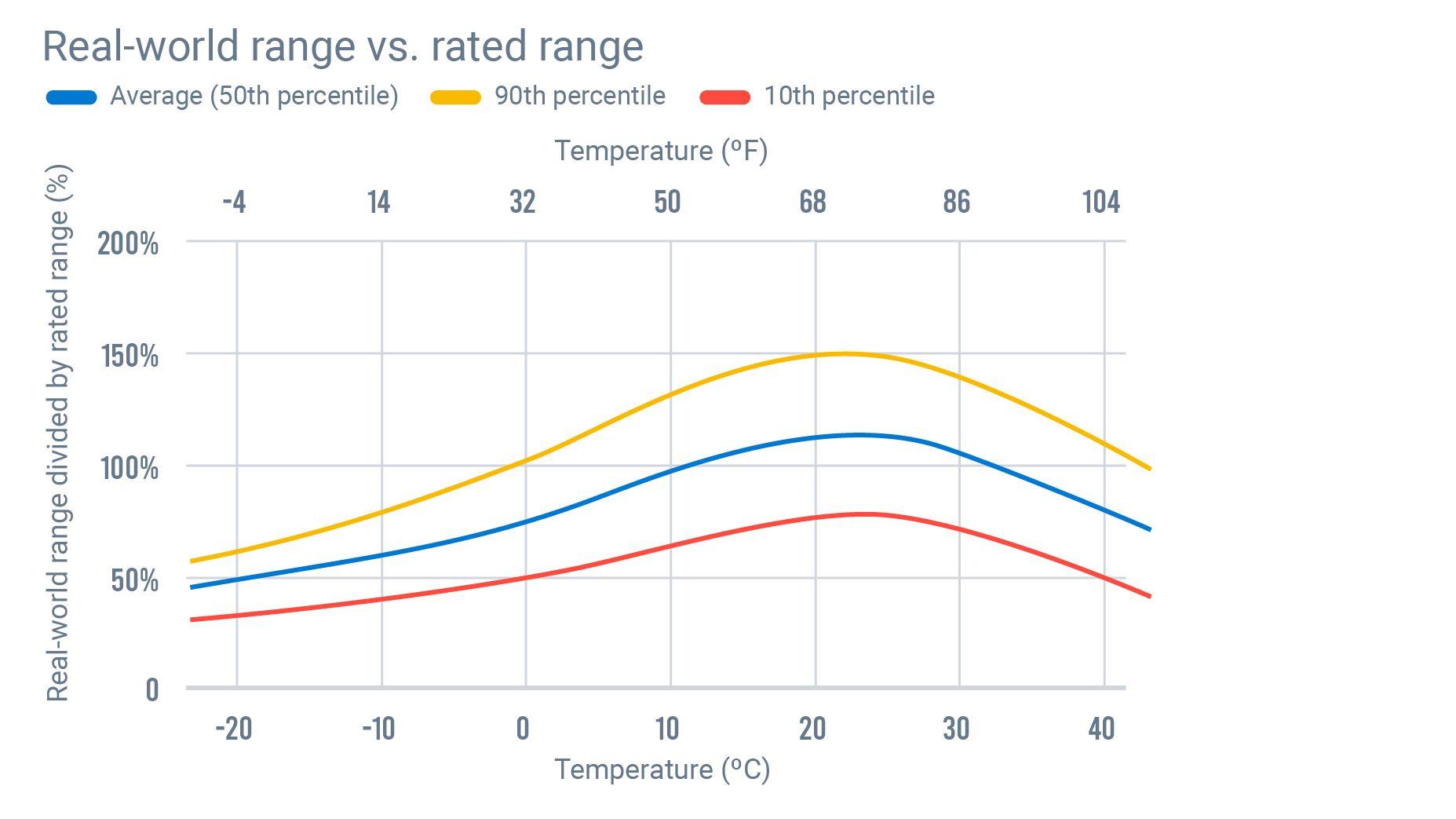 One study published earlier this year from telematics provider, Geotab compared vehicle’s rated range to the real-world range from 5.2 million EV trips. On average, vehicles were losing around 20% of their range in low temperatures down to 32°F and high temperatures up to 104°F.