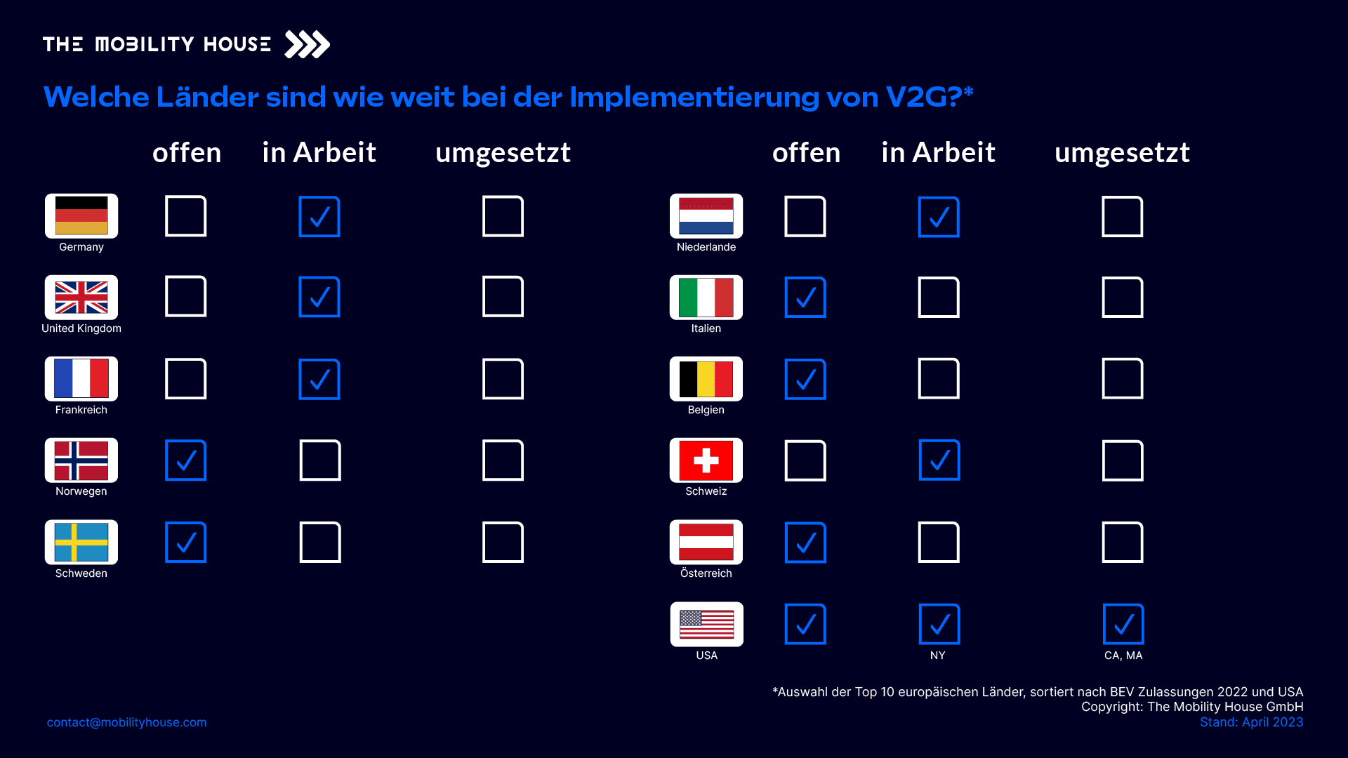 Die Umsetzung von V2G nach Ländern